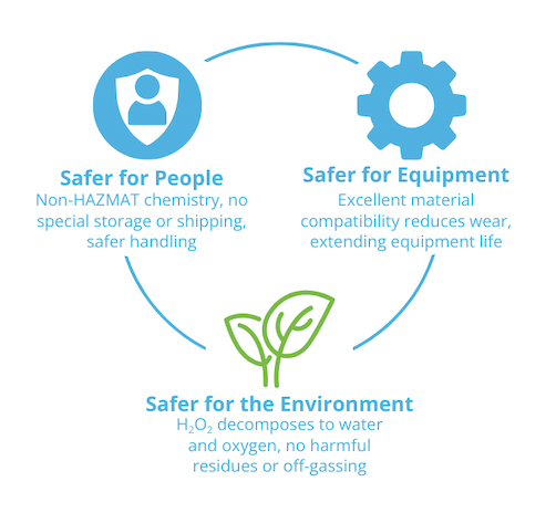 Non-HAZMAT chemistry and lower operating PPM (<135) mean safer handling for personnel, less risk of exposure, and streamlined training requirements.